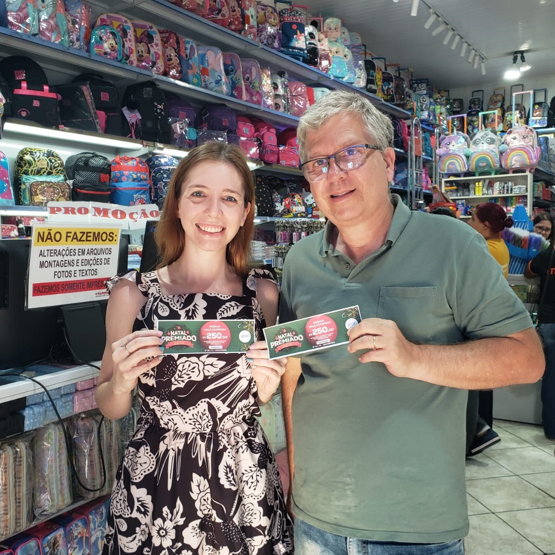 77 - O proprietário Mateus Quagiato, entregando o vale compras para a cliente Melani Apª Souza