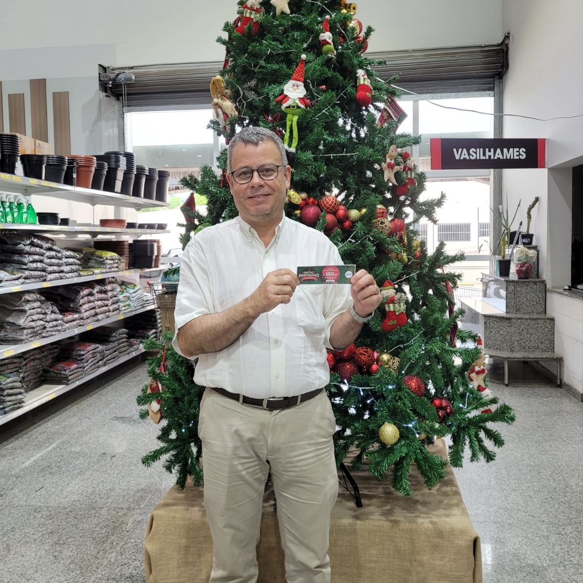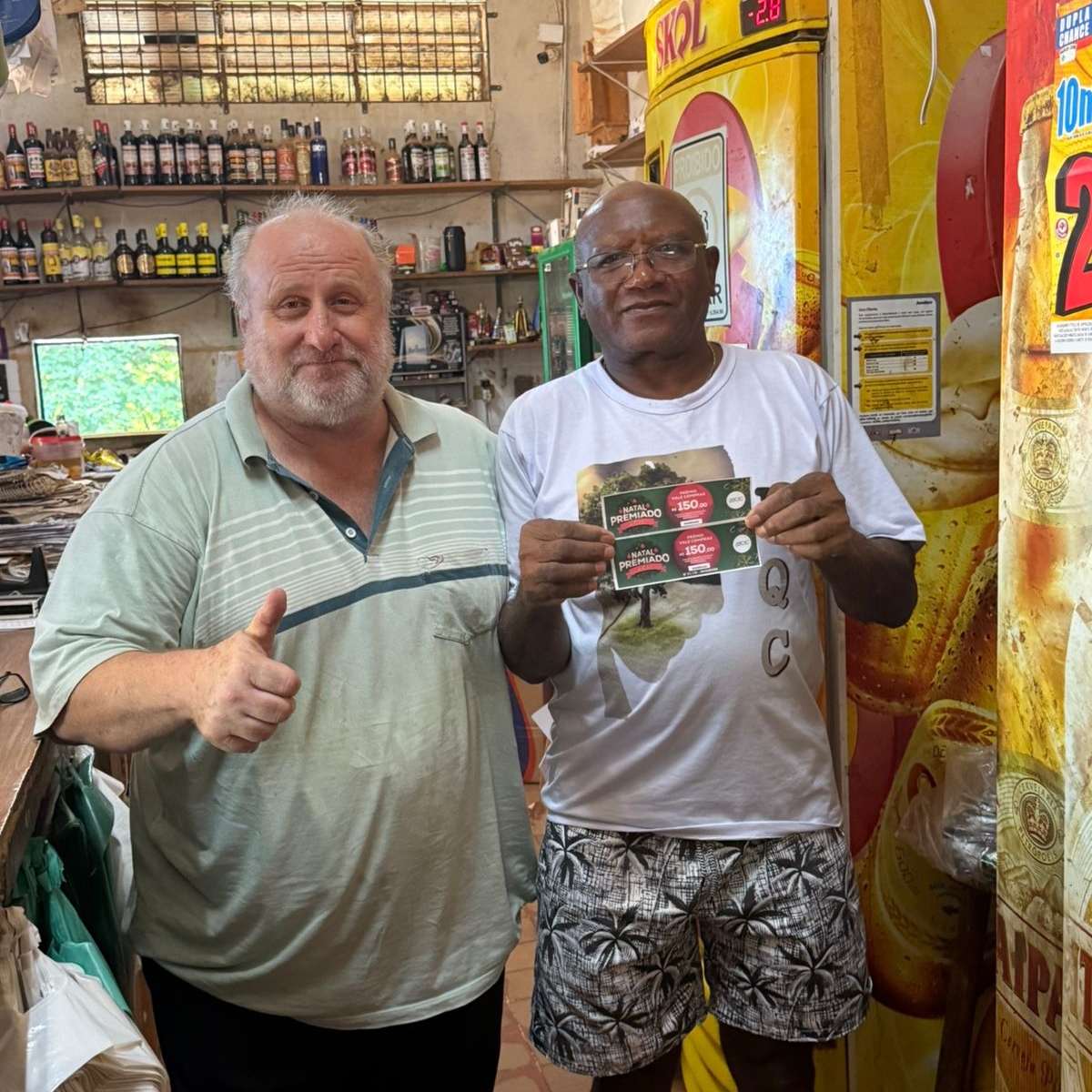 31 - Consumidor Claudio Benedito Amaral, recebendo o vale compras da colaboradora Isabela