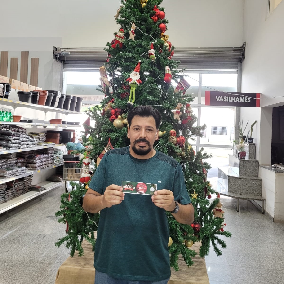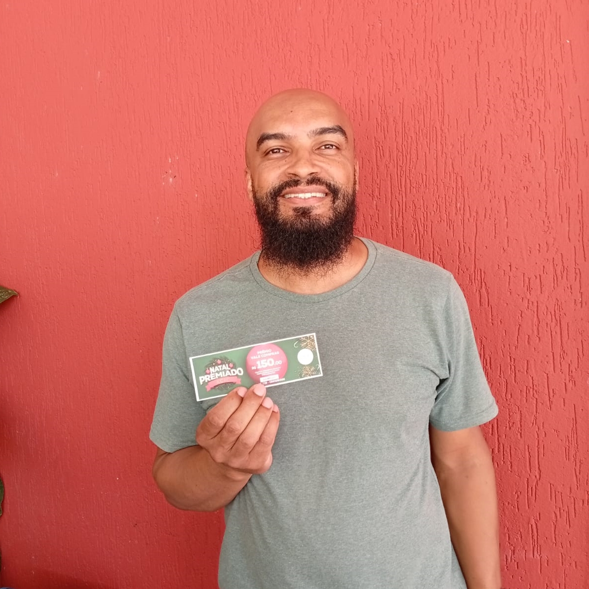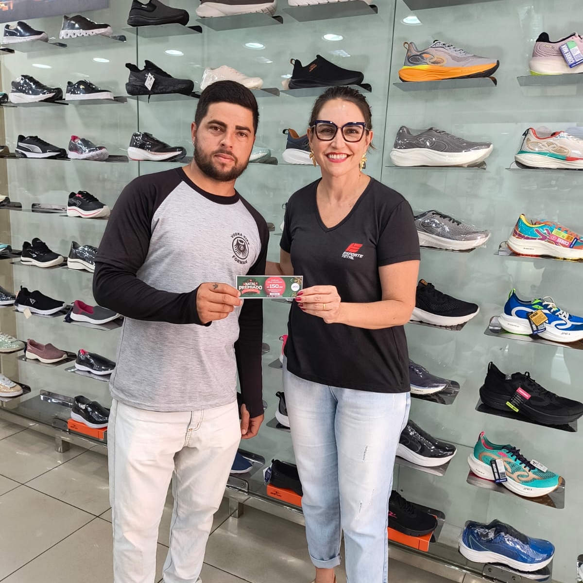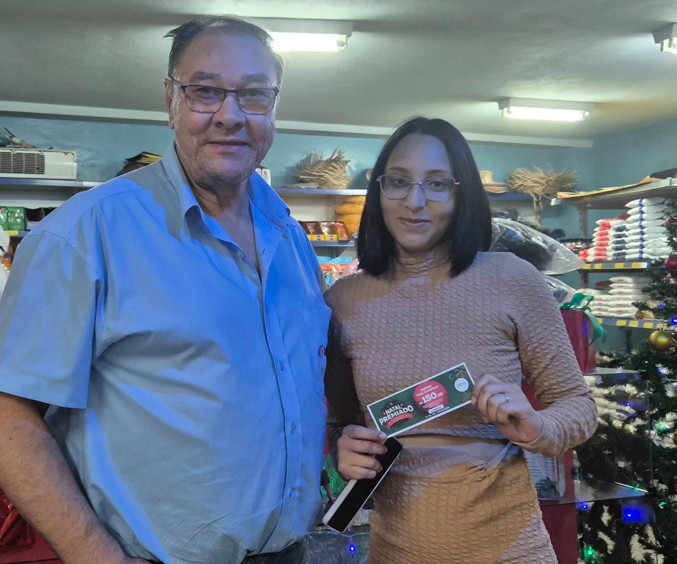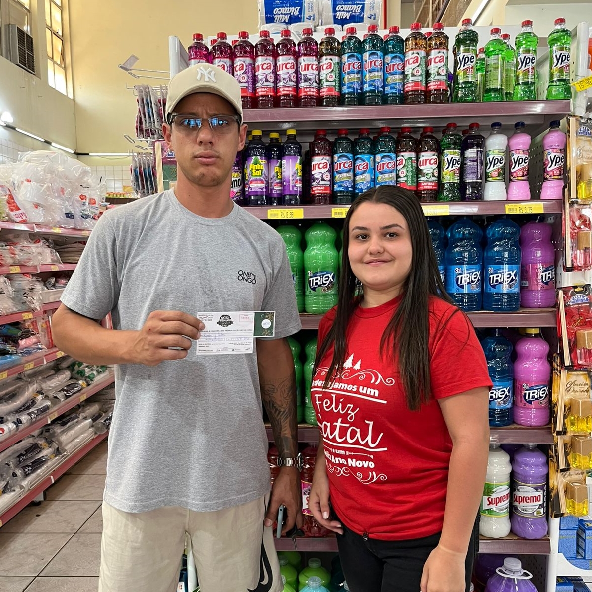 33 - Consumidor Renan Gonzalles Silva, recebendo o vale compras da colaboradora Aline