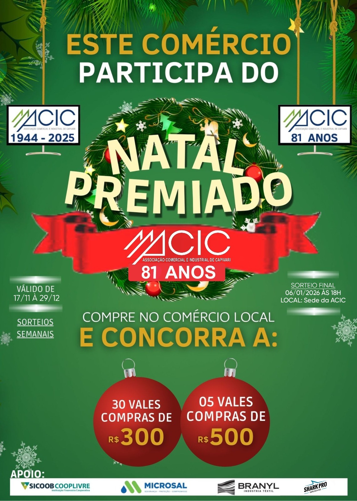 A Associação Comercial e Industrial de Capivari em parceria com o comércio e apoio da Sicoob Cooplivre, Microsal, Branyl e Shark Pro Suplementos lança no dia 17/11/2025 a Campanha "Natal Premiado ACIC 2025. Quem fizer suas compras no comércio participante da promoção, estará concorrendo a 30 prêmios sendo - 30 vales compras de R$ 300,00(lojas participantes) e 05 vales compras de R$ 500,00(sorteio na ACIC). O sorteio final será realizado no dia 06 de janeiro de 2026, às 18:00 horas, na sede da entidade.