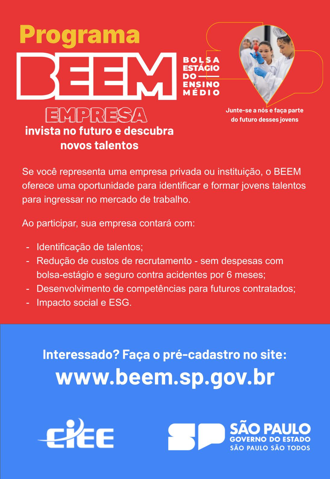 O Programa Bolsa Estágio do Ensino Médio (BEEM) oferece aos estudantes do Ensino Médio Técnico da rede estadual a oportunidade de realizarem estágio supervisionado e colocarem em prática os conhecimentos adquiridos em sala de aula.